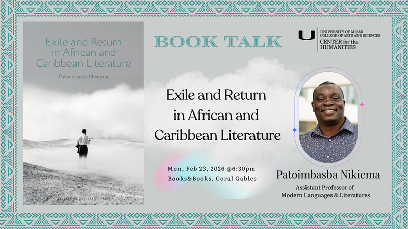 To register and learn more about the program, please click the image above. The Center for the Humanities invites you to join us at Books & Books in Coral Gables for a Book Talk with Patoimbasba Nikiema, Assistant Professor of Modern Languages & Literatures. Exile is often perceived as an irreversible rupture, a state of loss and estrangement. Yet, in African and Caribbean literature, exile and return form a dynamic interplay that reshapes personal, collective, and national identities. This book challenges traditional notions of exile as suffering and return as simple reconnection with homeland and loved ones, arguing that in many instances exile fosters deep introspection and transformation, while return serves as active engagement with the homeland’s sociopolitical and cultural realities. Through close readings of works by transnational writers, namely Khadi Hane, Malika Mokeddem, Dany Laferrière, and Alain Mabanckou, this study explores how exile and return create new forms of belonging, political consciousness, and cultural renewal. It gives voice to exiles navigating the displacement, alienation, and contradictions of the return. At a time when migration remains a polarizing issue in political discourses across Europe and the United States, this book reconsiders exile beyond narrative despair, revealing its potential as a space of reinvention. By bridging exilic imagination and homeland realities, this book offers a fresh perspective on how African and Caribbean writers envision the return as an Afrotopian project, a participative endeavor that rethinks the future of Africa and the Caribbean as a space of possibilities. Patoimbasba Nikiema an Assistant Professor of French and Francophone Studies / Global Black and Afropean Studies in the Department of Modern Languages & Literatures at the University of Miami. His research focuses on Postcolonial Studies with a particular interest in Afropean, Sub-Saharan, and Caribbean literatures and cultures around questions of migration, diaspora, race, gender, and transnationalism. He is currently working on the participation of transnational African and Afrodiasporic writers in the Afrotopia, both on the continent and in the Caribbean. Patoimbasba Nikiema serves as the President of the Francophone Caucus of the African Literature Association (FRACALA). Monday, February 23 @ 6:30pm