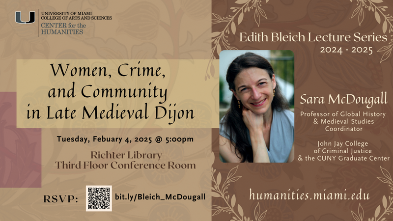 The Edith Bleich Lecture Series was established by Dr. Stuart Blumin in memory of Edith Bleich. Ms. Bleich was one the University of Miami’s earliest and most devoted students who began her academic career in 1926. Each year, the Center invites a humanities scholar to speak about their research to the University of Miami and South Florida community. This event is free and open to the public.