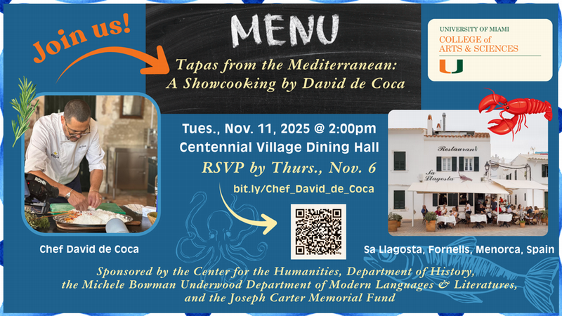 Coral Gables Campus, Centennial Village Dining Hall Join us for an exciting show-cooking with Chef David de Coca from Menorca, Spain! Click the banner above to RSVP by Thursday, November 6 We extended resgistration for this program but are ending it by noon today (Monday, November 10) to allow for planning and preparation. CLICK HERE for a banner to print or share! Chef David de Coca will offer a live demonstration of Mediterranean and Menorcan tapas inspired by traditional recipes and seasonal ingredients. The show-cooking will showcase how local dishes evolve through time and creativity. Attendees will have the opportunity to observe the preparation process, engage in conversation with the chef, and enjoy tastings that reflect the flavors, stories, and cultural flavors of the Mediterranean table. Chef David de Coca is a Spanish chef and the creative force behind Sa Llagosta, a renowned seafood restaurant in the port town of Fornells, Menorca (Spain). With a culinary philosophy centered on seasonality, sustainability, and simplicity, Chef de Coca has earned international recognition for reinterpreting regional recipes with a contemporary and ethnographic sensibility. Over the years, he has collaborated with internationally acclaimed chefs, including Michelin-starred figures, and his work has been featured in both national and international media. Passionate about culinary heritage and cultural storytelling, he frequently participates in public-facing events that explore the intersection of tradition, innovation, and identity through food. Sponsored by the Center for the Humanities, Department of History, and the Michele Bowman Underwood Department of Modern Languages & Literatures Lakeside Pavillion, Coral Gables Campus Join us for a roundtable discussion on Catalan cuisine with Chef David de Coca and Professor Paul Freedman! Click the banner above to RSVP and confirm your attendance. A discussion between Paul Freedman, a specialist in the history of food, and Chef David de Coca, owner of Sa Llagosta on the island of Menorca, and an expert on cooking historical dishes, on the intersection between food history and food preparation. What are the rewards of cooking historical recipes? What are the challenges of presenting them to a contemporary audience? How can academic research help chefs in presenting traditional cuisine? How can chefs help historians think about the history of food? This program is free and open to the public as well as held in conjunction with the 44th International Conference of the Haskins Society at the University of Miami. Sponsored by the Center for the Humanities, Department of History, the Michele Bowman Underwood Department of Modern Languages & Literatures, and the Joseph Carter Memorial FundTuesday, November 11, 2025 @ 2:00pm
